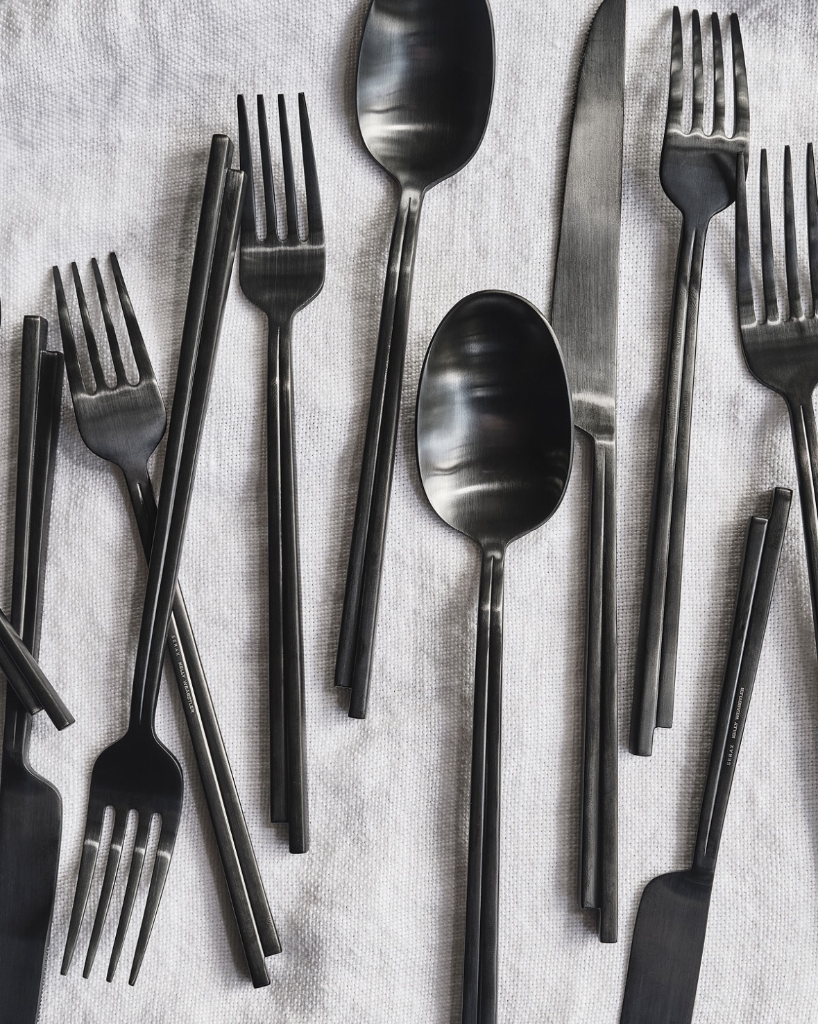 Het bestek ‘Dune’ in zwart staal van Kelley Wearstler by Serax valt niet alleen op door zijn kleur maar ook door zijn bijzondere vormgeving. Het is geïnspireerd op werk van de Oostenrijkse architect en designer Josef Hoffman. De essentie van het bestek ligt in het expressieve offset detail en het elegante splijt effect over de lengte van de steel. Elk stuk wordt gegoten en met de hand gepolijst. Het bestek is verkrijgbaar in twee afwerkingen, roestvrij staal en gezwart staal. Dit is de zwart stalen versie.