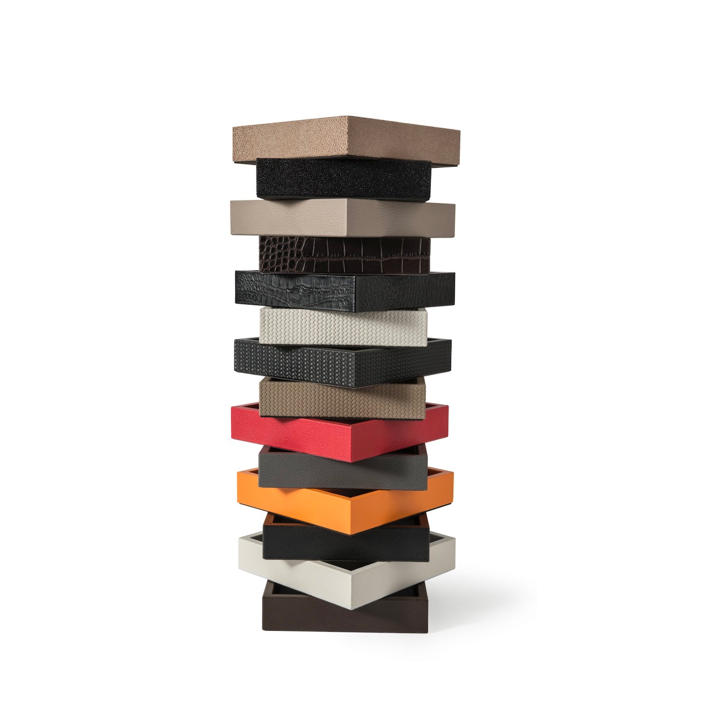 This small tray is available in two different sizes (square and oblong) and is ideal for your small accessories, or just purely as decoration. As a decorative object ideal for your bedside table or in your living room, in two convenient sizes. The rectangular variant is also very stylish in the toilet for hand wash and hand lotion. Available in both sizes in taupe and other sizes, colours and leathers to order. Please ask us about the possibilities. Handmade in Italy.
