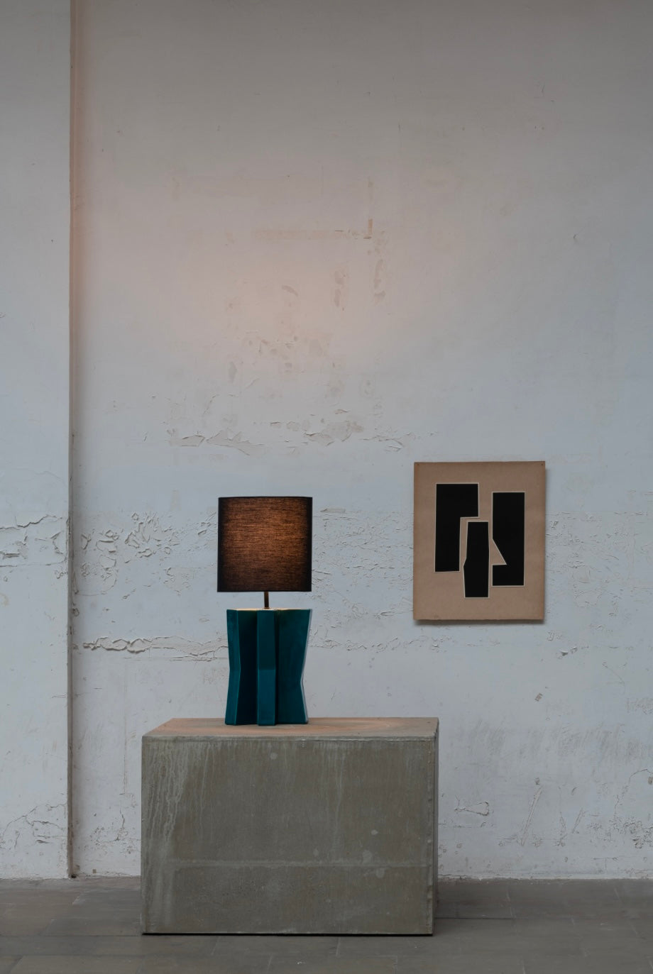 A sculptural handmade table lamp with a base of blue ceramic and a black shade. The design comes from the hand of renowned designer Bob Verhelst. The special ceramic base gives the lamp a retro feel but the design makes it very contemporary. The black shade of natural materials complements the sculptural base perfectly. This lamp is also a real eye-catcher because of its size and will look great from living room to bedroom. This lamp is also available in light grey.