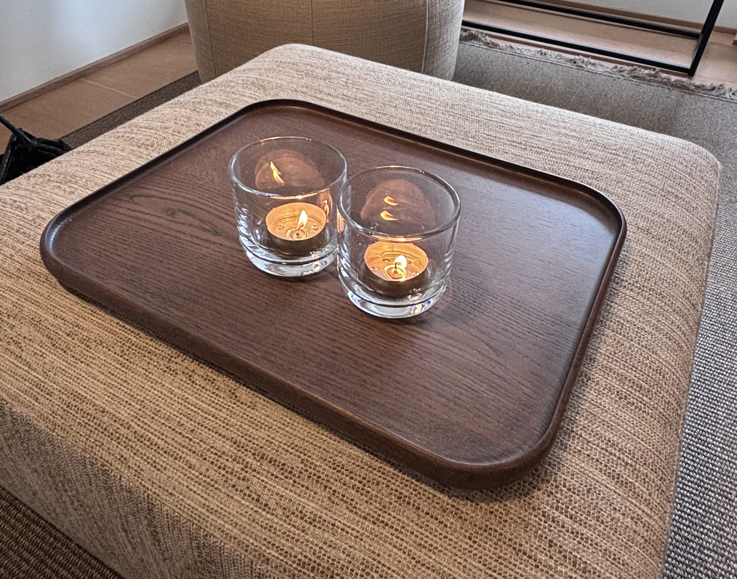 Dit dienblad ‘Noble’ is ook verkrijgbaar in naturel, zwart, wengé en walnoot finish. Deze dienbladen serie ‘Noble’ past perfect bij Scapa Home’s nieuwe meubel serie ‘Vince’ die in dezelfde eiken finishes vervaardigd worden.