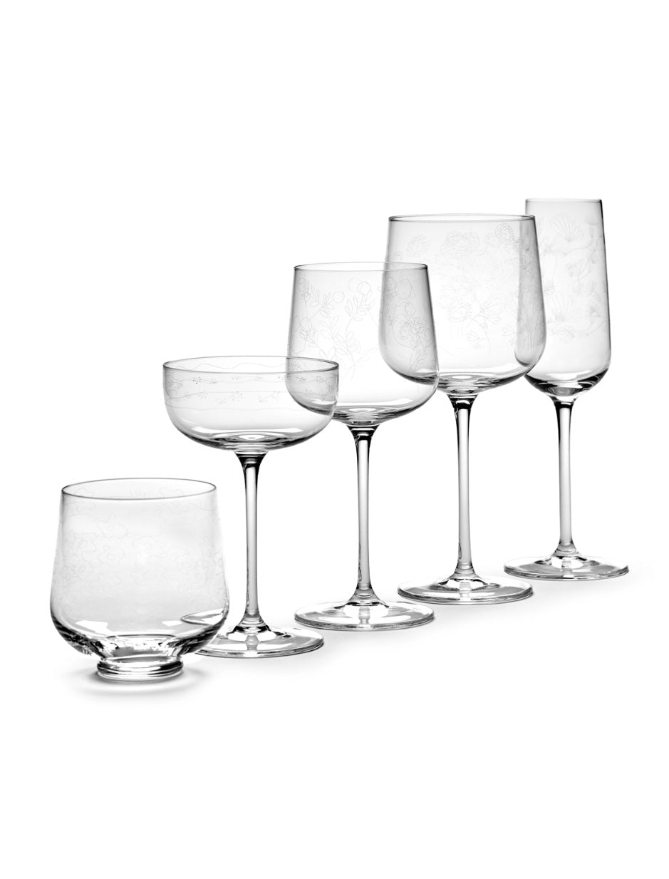 Elegant witte wijnglas ‘Mirtillo Tea’ ontworpen door Marni voor Serax heeft een ingegraveerd bloemmotief van gestileerde bosbessen. Het verfijnde glas past perfect bij luxe servies ‘Midnight Flowers’ van Marni. Maar als je gewoon op zoek bent naar hele bijzondere glazen dan zit je bij deze artistieke glazen helemaal goed.