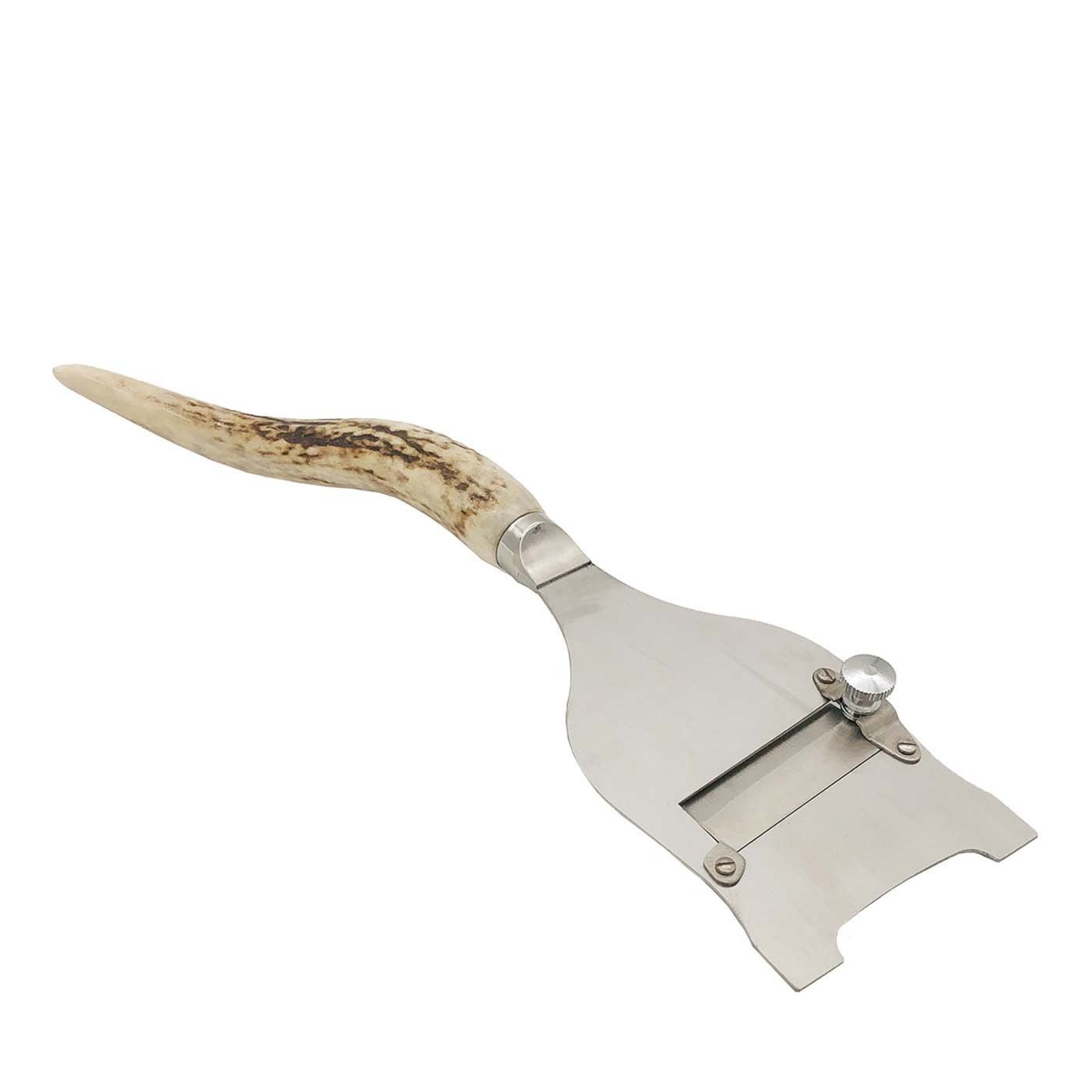Een onmisbaar accessoire in de gastronomische keuken, in een uiterst luxueuze uitvoering. Deze truffelsnijder heeft een roestvrij stalen blad dat aangepast kan worden naar de gewenste dikte van de plakjes. Een echt gewei vormt het elegante handvat van deze truffel snijder. Hij ligt daarmee niet alleen heel goed in de hand, maar is ook heel mooi vorm gegeven.  Dit handgemaakte luxe gebruiksvoorwerp wordt speciaal voor ons op bestelling gemaakt en heeft een levertijd van ongeveer 6 weken. Een bijzonder cadeau voor de truffel lovers onder ons en een ideale toevoeging aan onze luxe collectie servies en bestek! De afmeting van deze truffelsnijder is 34 cm lang x 10 cm breed.