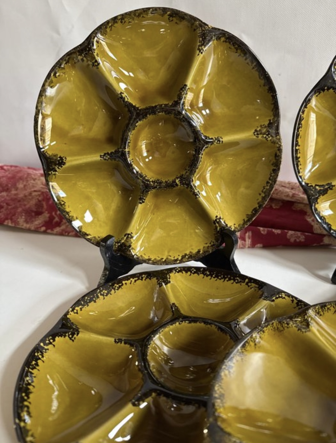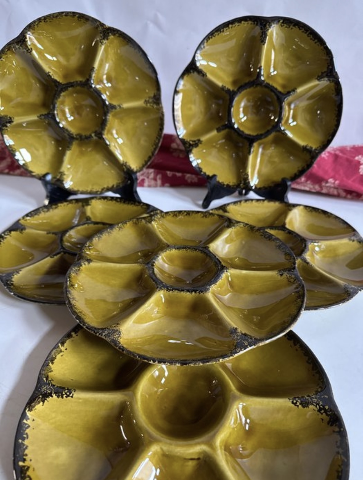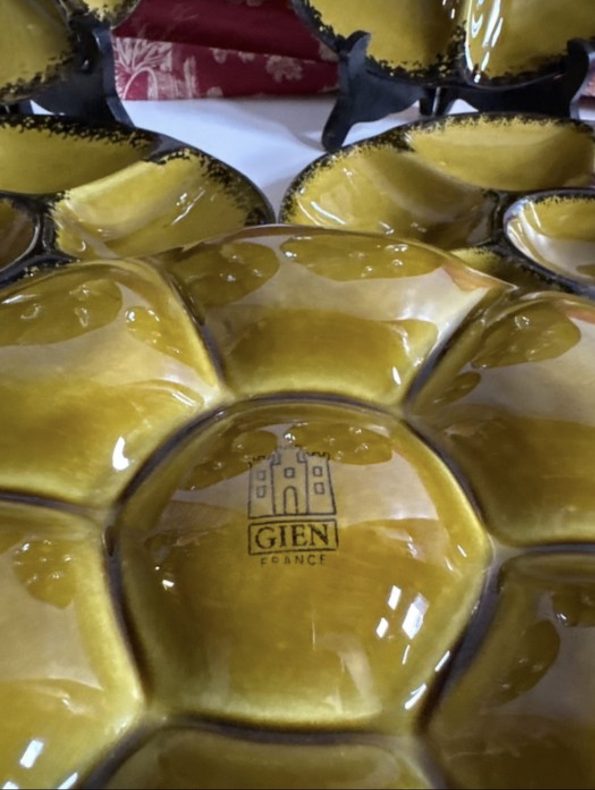 Exclusieve vintage handgedecoreerde Franse oester- en zeevruchten serviesset van het beroemde Franse servies merk Gien. Gemaakt van keramiek met een oker achtergrond met zwarte, gestencilde randen. Complete onbeschadigde set voor 6 personen. De borden hebben een diameter van 24 cm. Alle borden zijn voorzien van het keurmerk en het monogram van het merk Gien.